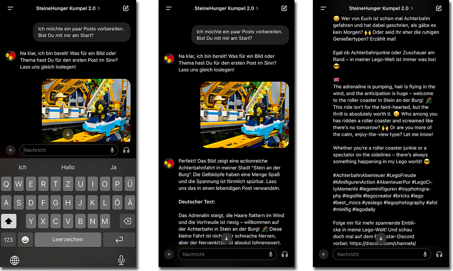 Nehmen wir zum Beispiel meinen privaten Instagram-Kanal „Steinehunger“, auf dem ich meine eigenen Lego-Bauwerke und Sets präsentiere. Früher habe ich viel Zeit damit verbracht, die passenden Texte für meine Instagram-Posts zu erstellen. Heute lade ich einfach ein Bild in meinen „Steinehunger-Kumpel“ CustomGPT hoch und in 98 % der Fälle habe ich sofort einen fertigen Beitrag. Einmal drüberlesen, ins Planungstool (ich verwende Buffer) kopieren, Bilder dazu – fertig. Diese Routine hat nicht nur meine Produktivität gesteigert, sondern auch meinen kreativen Freiraum erweitert. Die Screenshots zeigen die Praxis. Und ich bespiele nicht nur meinen privaten Kanal auf diese Art und Weise, auch wenn sich die Vorgehensweisen etwas unterscheiden.